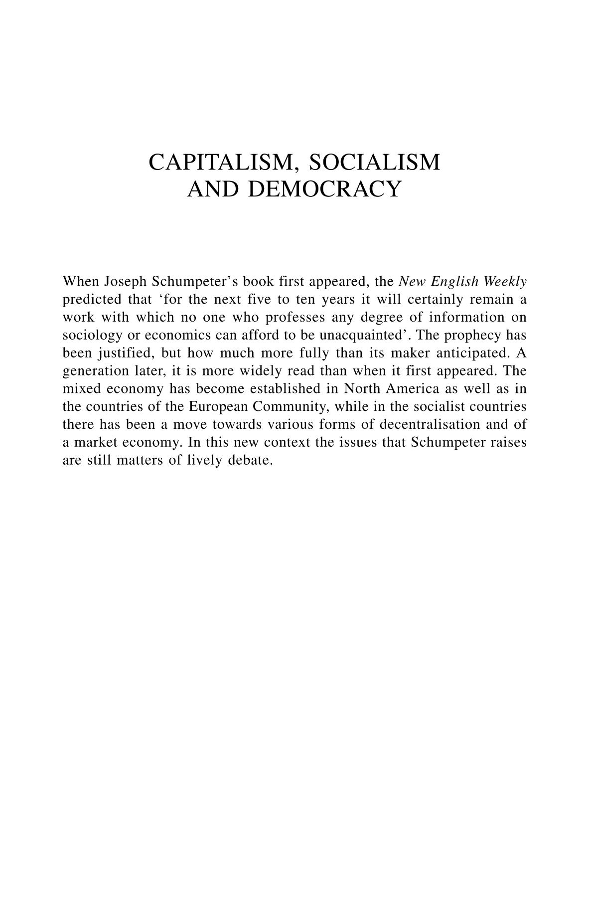 Capitalism, Socialism and Democracy remains one of the greatest works of social theory written this century. When it first appeared the New English Weekly predicted that `for the next five to ten years it will cetainly remain a work with which no one who professes any degree of information on sociology or economics can afford to be unacquainted.' Fifty years on, this prediction seems a little understated. Why has the work endured so well? Schumpeter's contention that the seeds of capitalism's decline were internal, and his equal and opposite hostility to centralist socialism have perplexed, engaged and infuriated readers since the book's publication. By refusing to become an advocate for either position Schumpeter was able both to make his own great and original contribution and to clear the way for a more balanced consideration of the most important social movements of his and our time.