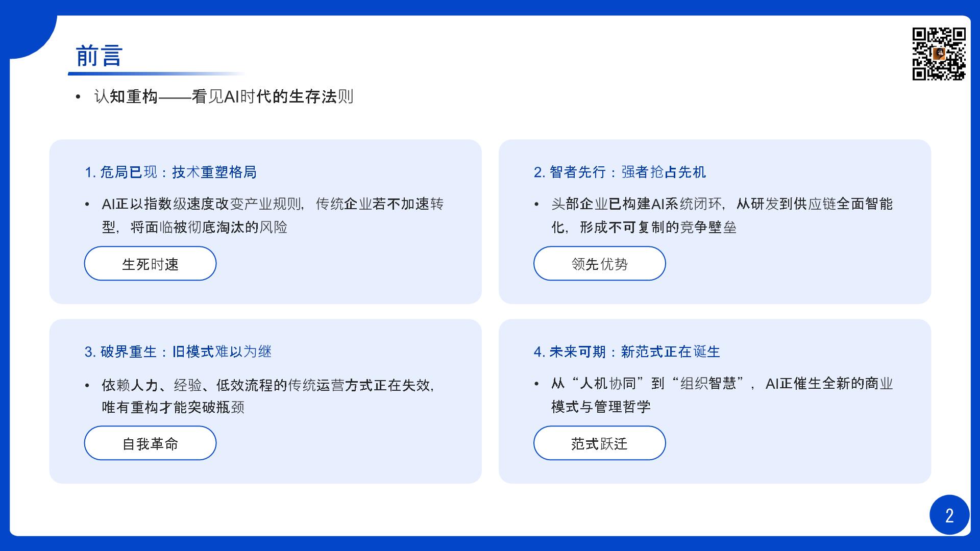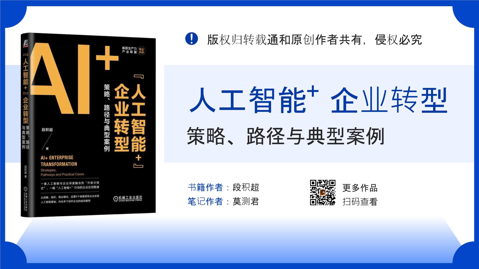 以 “战略 — 组织 — 商业模式 — 运营” 四维框架,为 5 类不同规模企业提供 AI 转型的实操策略与行业案例,是从顶层设计到落地的实战指南。