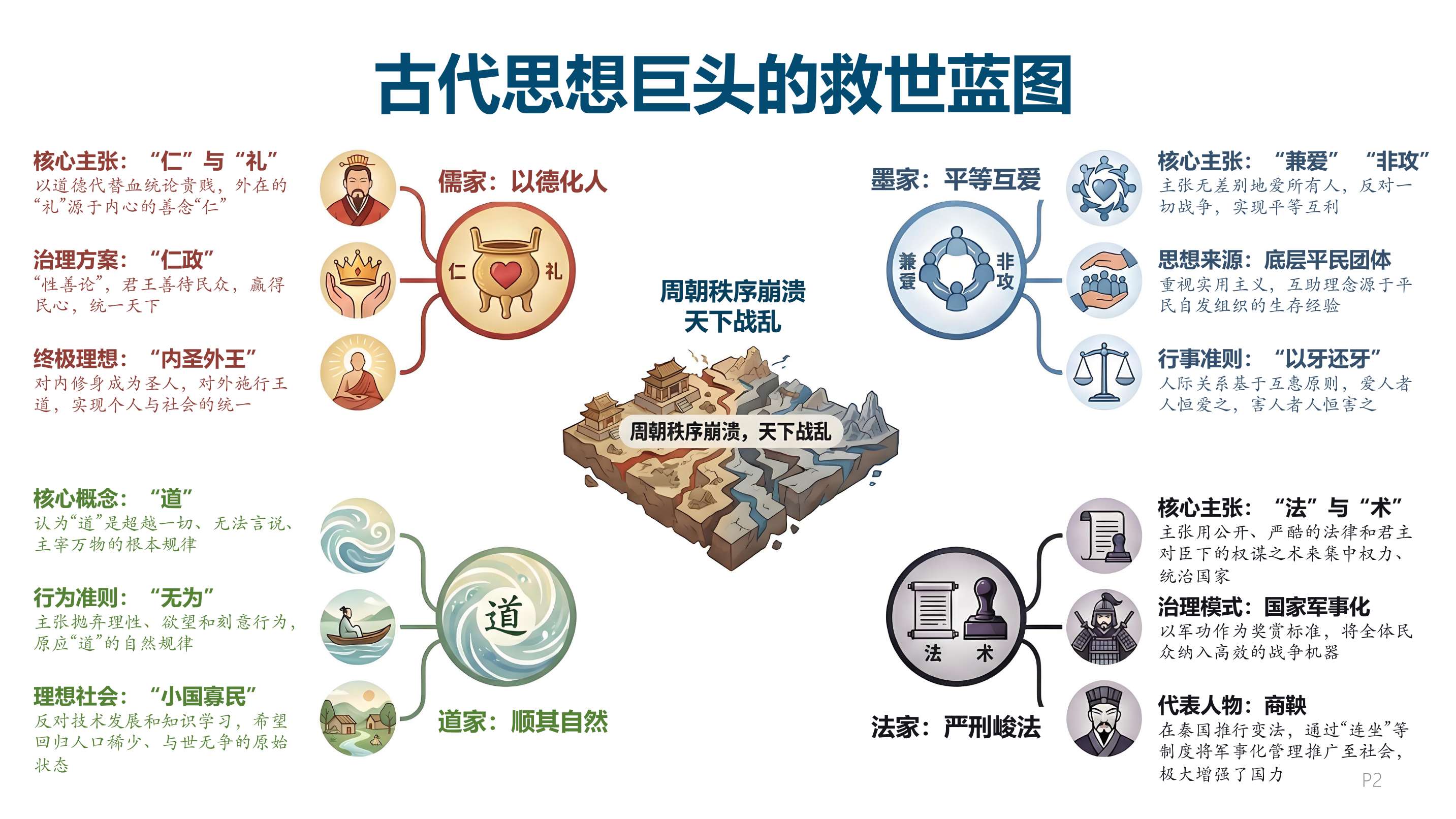 孔子首先开出药方:混乱源于人心坏了,关键是恢复“仁爱”与“礼制”,靠教育培养君子。墨子代表平民发声,主张无差别的“兼爱”与“非攻”。孟子乐观坚信人性本善,只要君王施行“仁政”就能天下归心。老子则反向思考,认为一切混乱都源于“瞎折腾”,主张“无为而治”,退守“小国寡民”。